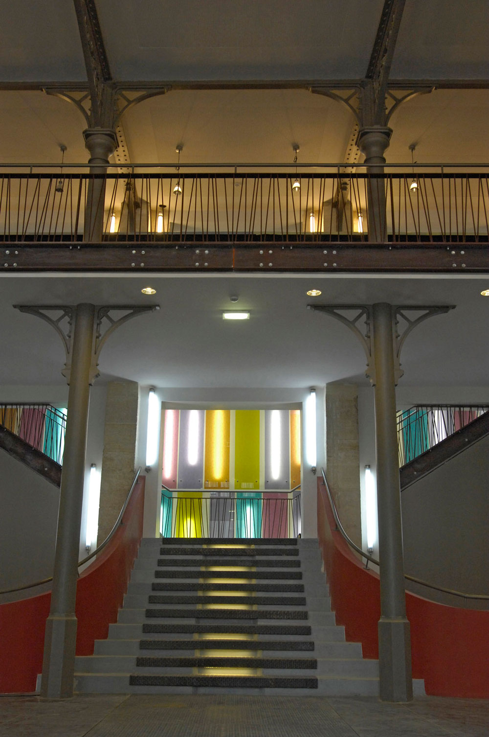 Brossy took the 19th century industrial building into a new era, carving a 300 seat auditorium, a large rehearsal space under glass, audio and visual studios into the factory floors. In the old entrance hall and the mezzanine café multi-coloured sheets of glass and fluorescent lights mingle with original details such as the arabesques in the iron structure.